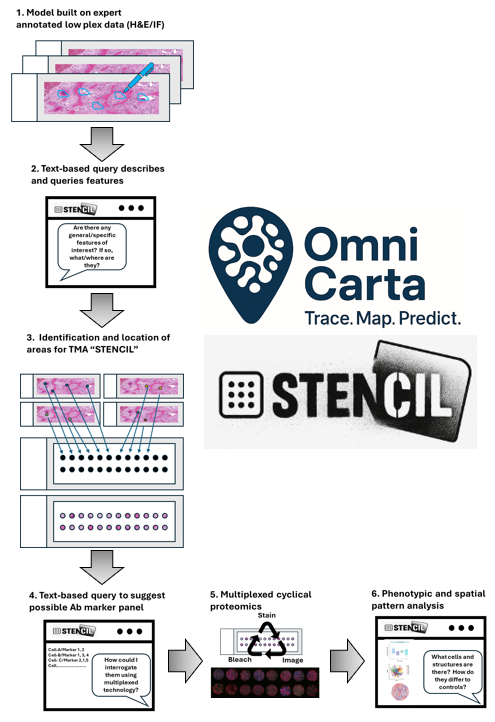 Traditional methods for multiplexed spatial proteomic imaging are incompatible with scale, throughput and budget. To this end we have developed STENCIL (Spatial Triage Engine for Navigating Cellular Imaging Locations). STENCIL is your AI-driven pathology partner that firstly assists with selecting areas of tissue from low plex H&E images to create Tissue Micro Array (TMA) slides. Secondly it assist with the creation of antibody panels for multiplexed tissue imaging to compressively characterise both the cellularity and architecture of the selected tissue areas. Lastly it also aids in the analysis and interpretation of the data, comparing it to a database of age matched wildtype mice to provide a "tissue perturbation score" that aids in assessing drug risk.